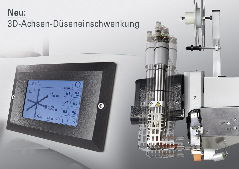 • Alle relevanten Prozessparameter (Luft, Druck, Temperatur und Geschwindigkeit) sind per Touch-Screen programmierbar und speicherbar. Die neuartige 3D-Achsen-Düsenpostition der neuen PFAFF 8333 liefert nun das letzte fehlende Glied für eine einzigartige Prozesssteuerung.