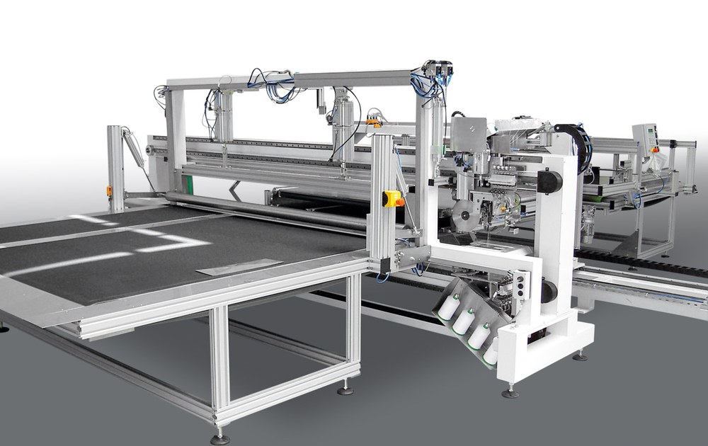 Quernähstation zum zum Ablängen bei gleichzeitigem Säumen von Matratzenplatten oder Steppdecken