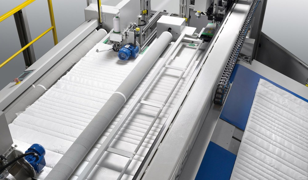 4-needle cross sewing system to cut to length and simultaneously seam of mattress plates