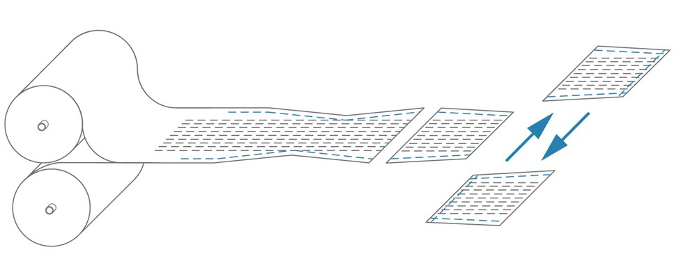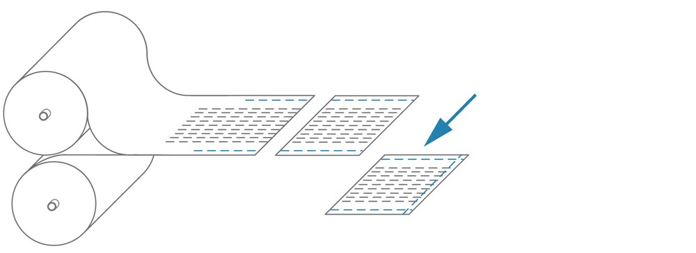 Double bottom seam Double bottom seam, cut to the desired filter pocket size by the overlock machines of the bottom seam station (depending on the orientation of the pocket) to the right or left side of the machine