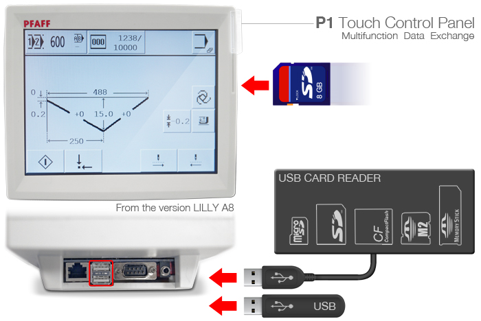 Programmdaten können durch kopieren auf SD-Karte, USB-Stick oder Multicard-Reader gesichert und auf andere Maschinen überspielt werden. Zudem kann auf diesem Weg auch die Software jederzeit aktualisiert werden