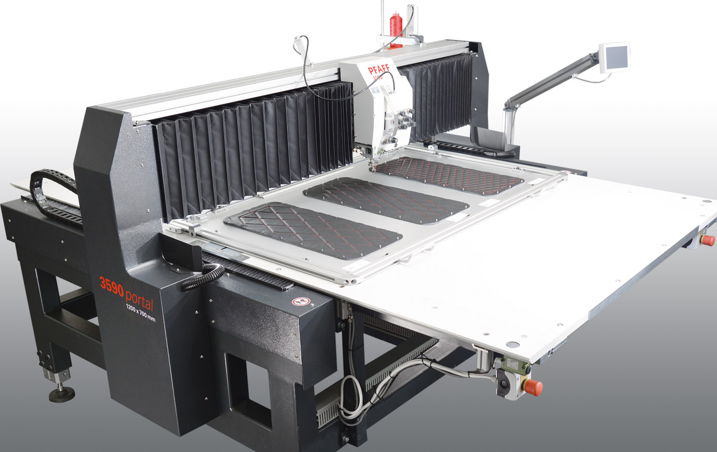 Freely programmable large-field computer stitchers of the new generation PFAFF 3590 portal are efficient sewing units "Made in Germany". Know how paired with experience and the latest technologies in engineering, drive and control technology, set the pattern when it comes to reliability and process security. The sophisticated sewing technology based on our marathon vertical hook and an unique seam optimizing system provide the highest seam quality and a perfect stitch quality in multidirectional sewing over the whole sewing area. All complex top-stitch and decorative stitching operations can be mastered with this new PFAFF 3590 portal.