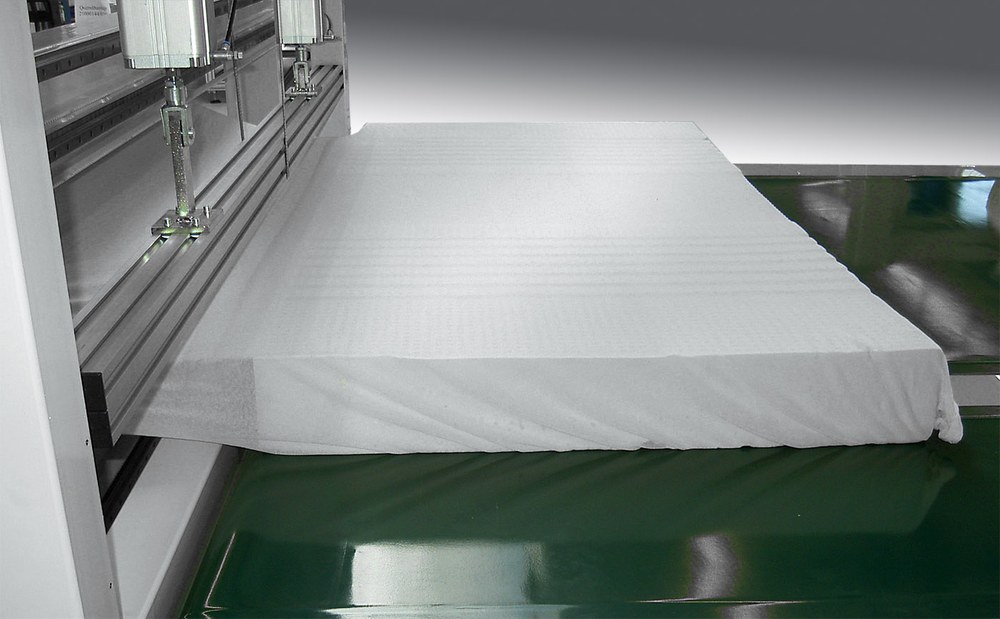 Fixing and compressing device (integrated into the cross-seam station) to press and affix the two mattresses which are covered in tricot and opposite one another during the cross seaming and cutting